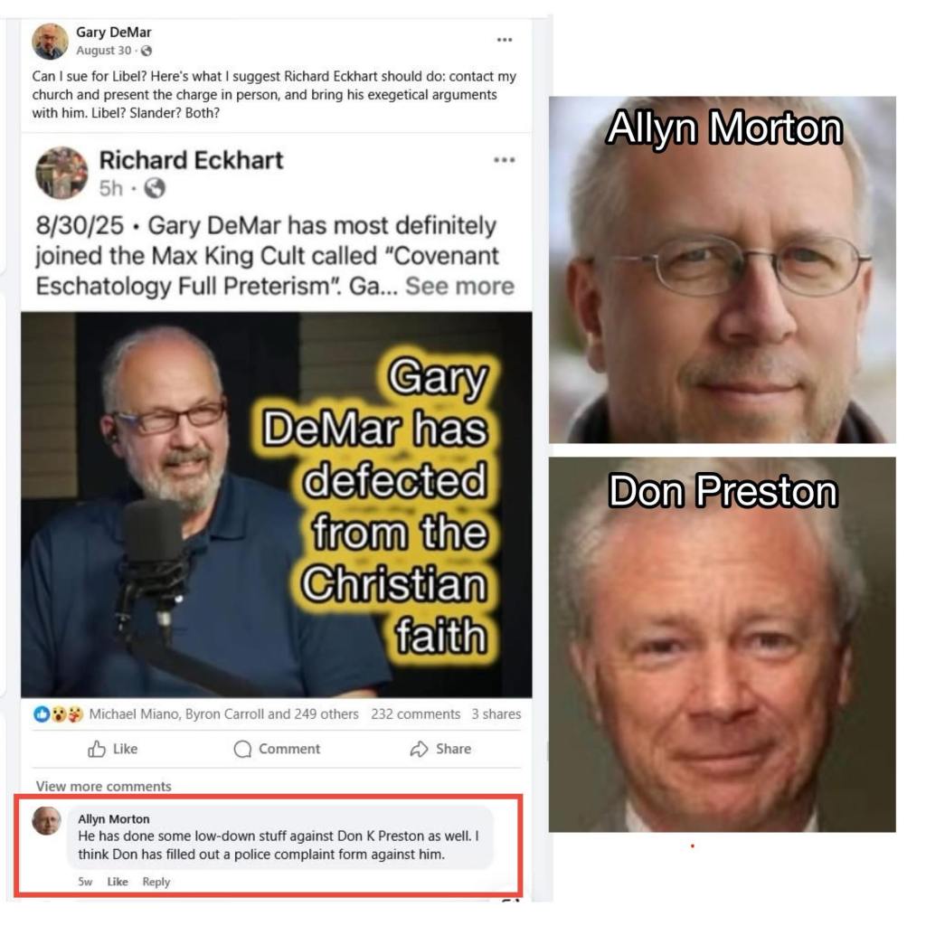Don Preston’s really good buddy, Allyn Morton, says to Gary DeMar about me, “He has done some low-down stuff against Don K. Preston too. I think Don has filled out a police complaint form against him.” (See red rectangle area in attached image)