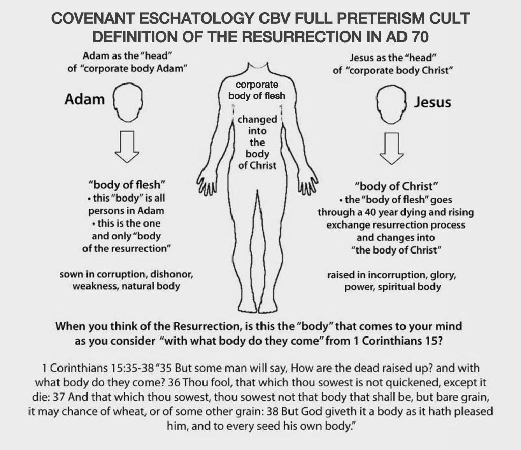 Heads up! There is no such thing as a “corporate body view” of “the body of the Resurrection” in Scripture. Yes, this is cult language with cult definitions in the Covenant Eschatology Full Preterism Cult!