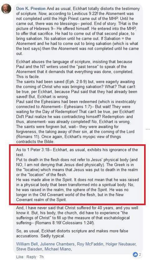 Like true Gnostics, the Covenant Eschatology Full Preterism Cult members say life and death are exclusively spiritual, and you can ascend and transcend any biological physical issues by claiming that sin and death have absolutely nothing to do with your personal biological body. They have no concept of “sins of the flesh”, because the top teacher in this cult, Don Preston, teaches that “in the flesh” means to be “in the realm, location, and sphere of the old covenant world of the flesh”. This hyper-spiritualizing of sin, death, and the flesh is radically irresponsible and unacceptable!