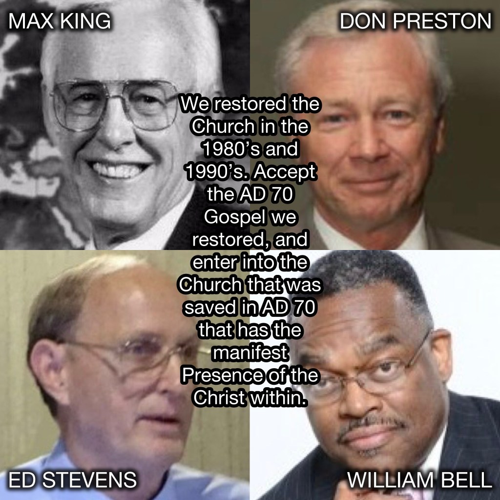 The Christ has come in AD 70! He is here right now! Feel his Presence! Join the new covenant world and creation Church that was saved in AD 70, and get into the mystical Presence of the mystical Christ that is being manifested on Earth through the corporate body of Christ that was resurrected in AD 70, the New Age Church that is run by the New Age apostles and prophets of Max King like Don Preston, William Bell, Ed Stevens, Gary DeMar, David Curtis, Mike Sullivan, Zach Davis, Tim Martin, Robert Cruickshank, Rick Welch, Kim Burgess, Michael Miano, Ward Fenley, Joel Rosenauer, Jeff Vaughn, Travis Drum, Steve Magua, Holger Neubauer, Larry Siegle, Allyn Morton, Roy Runyon, Cindye Coates, Alex Polyak, Charles Meek, Kristin Bingamon, Spencer Avadiah Smith, Daniel Rogers, Travis Drum, Don Nobinger, Adam Maarschalk, Stacey Turbeville, Dallas Burdette, and some others.