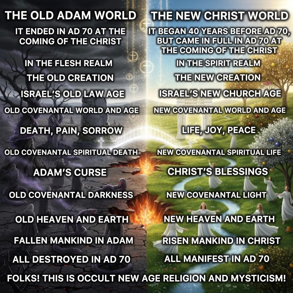 Now remember! The “New Covenant Eschatology Gospel” is the “old Adam world” ended in AD 70, salvation and atonement for “spiritually dead old covenant age people” came in AD 70, the “new Christ world” came in AD 70 at the “coming of the Christ in Spirit” in AD 70, and if you put your faith and trust in this New Gospel, you will receive the Presence of the Christ and be saved from “old covenant world spiritual death and sin”.