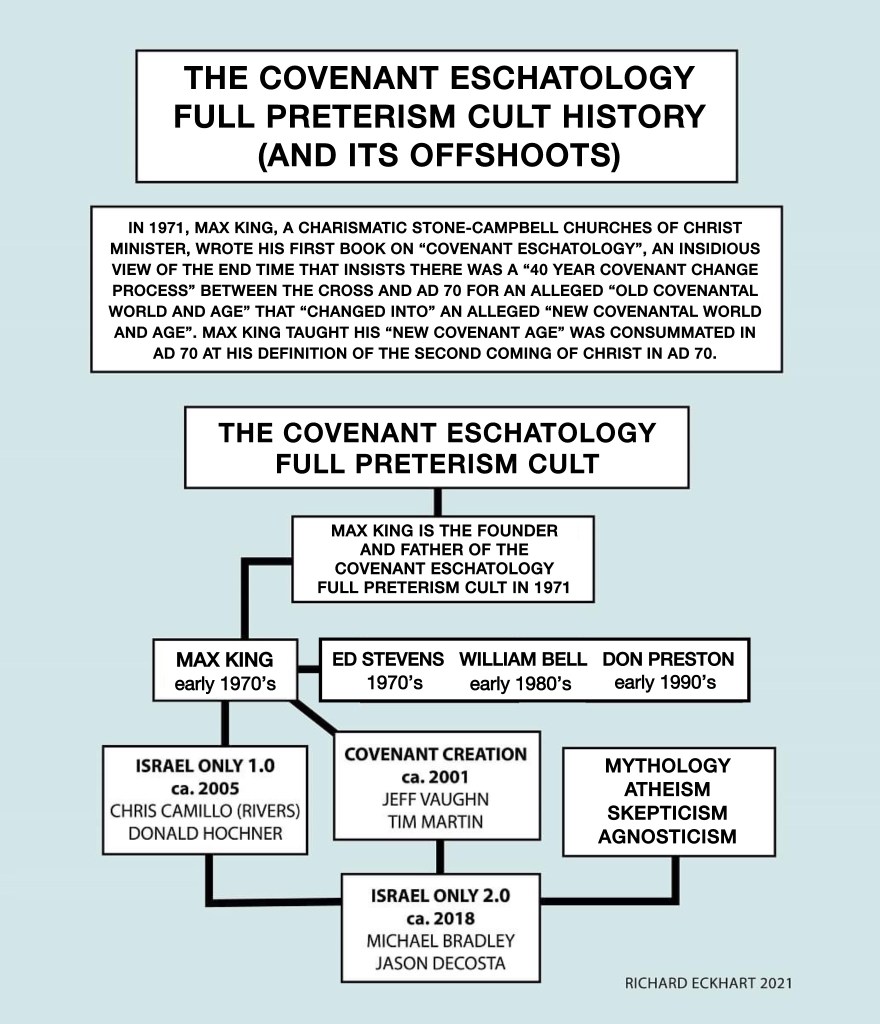 The huge glaring problem with the Covenant Eschatology Full Preterism cult – which includes its offshoots Covenant Creation and Israel Only – is that they make “Israel’s story” be the central story in the Bible. Since they make the Bible be “Israel’s covenant redemption story”, they need to take “Israel” and “covenant” all the way back to Adam and the Adamic death problem, which is where Covenant Creation comes in. Covenant Eschatology Full Preterism, and its offshoots Covenant Creation and Israel Only, really blow it big time by not understanding and perverting what God‘s overall redemption plan is all about. Everything they falsely teach gets stuffed into false definitions of sin, death, redemption, salvation, justification, atonement, flesh, glorification, immortality, incorruption, resurrection, and more. When you get the end wrong (which they do), and you stuff everything into this wrong end, you’ve got a confusing syncretism mess on your hands, where you’ll say and do anything to try and make your heretical end work! This is exactly what the Covenant Eschatology Full Preterism cult does! The Bible is far more grand in scale than merely looking at Israel’s redemption story, which is only a part of God’s overall redemption plan!
