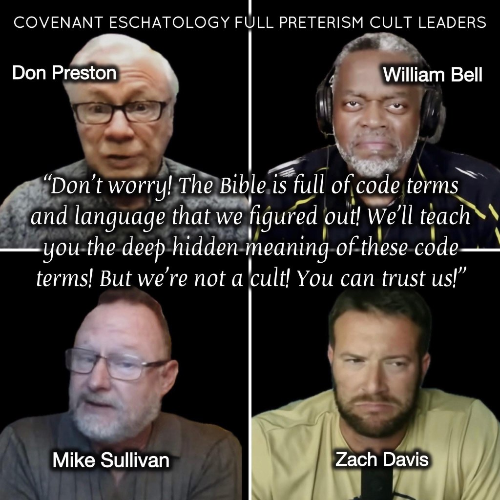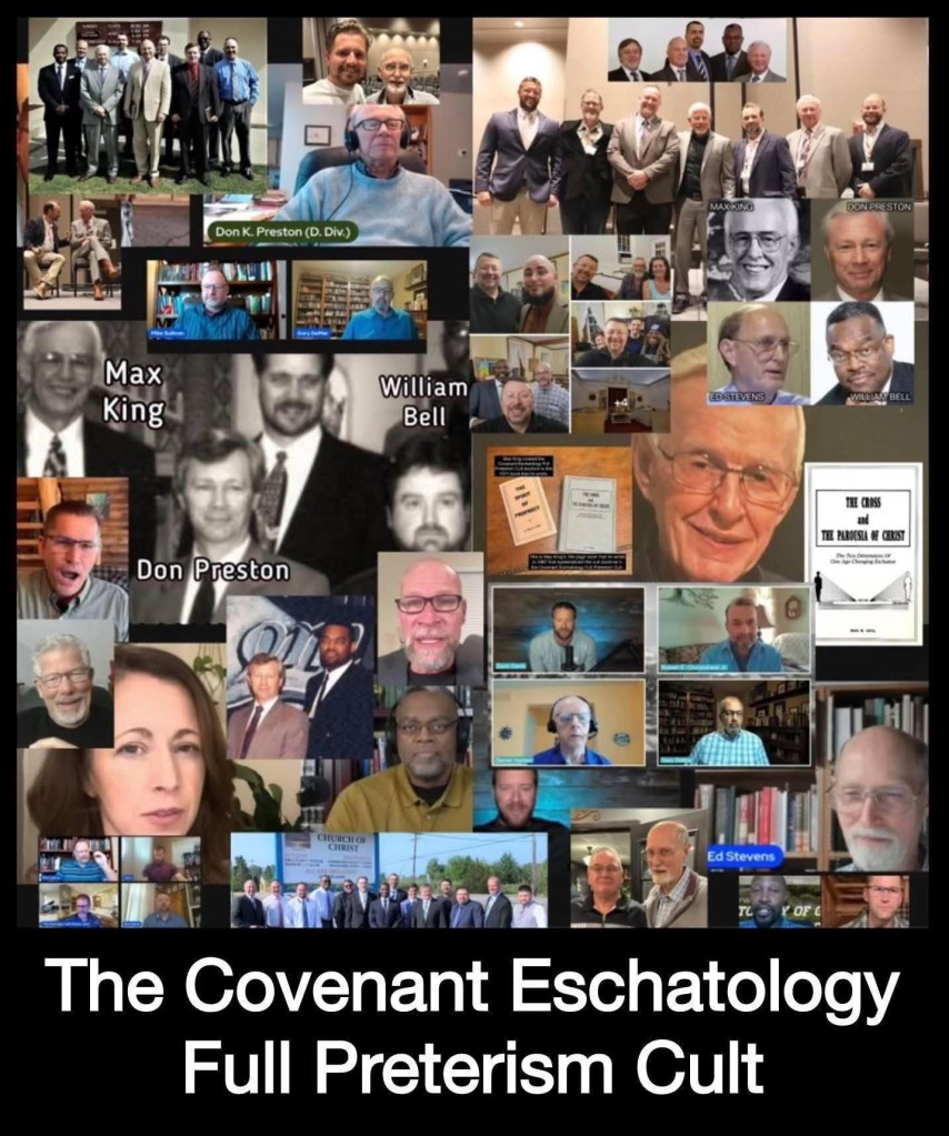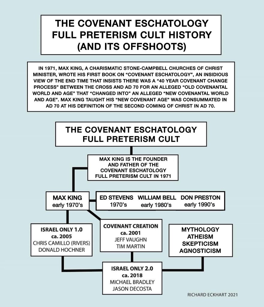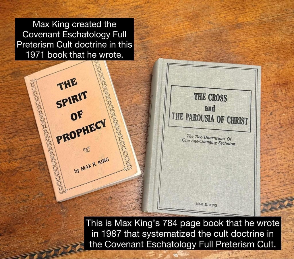 “Covenant Eschatology” Full Preterism was founded by Max King in 1971. This cult and cult doctrine was taken to the streets by Don Preston, Ed Stevens, and William Bell. All four of these men made religious business careers out of Max King’s heretical “Covenant Eschatology” framework. ALL of “Covenant Eschatology” today – including its offshoots “Covenant Creation” and “Israel Only” – is heresy and blasphemy, and to follow after any of these false teachers proves you to be a heretic and blasphemer right now! This includes the false teacher Gary DeMar – who is NOT just “asking questions”! Gary DeMar is now teaching “Covenant Eschatology” and still regularly meeting with Max King Cult members! ALL of these teachers are snakes and devils who are in the business of deception and playing the confidence trick game (the con game). These guys are conning people as cult leaders in the Max King Cult called “Covenant Eschatology” Full Preterism!